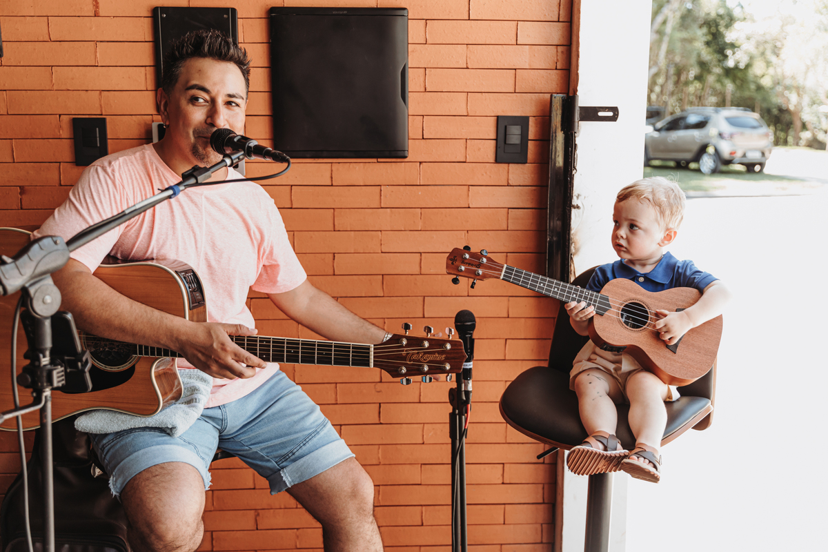 Era um dia quente.. muito.. muito quente mesmo!! Quando cheguei na chácara da família, estava tudo prontinho e o aniversariante tirado uma sonequinha. Estavam todos ansiosos para ver o Rael dar o seu show!! Ele é APAIXONADO por música, e não.. na família não tem nenhum músico! Todos os instrumentos da decoração eram dele, a mamãe arrumou cada detalhe e ela mesmo imprimiu a papelaria personalizada. Cada detalhe com muito amor e o Rael respondeu à altura!! Cantou e tocou muito para o seu público <3